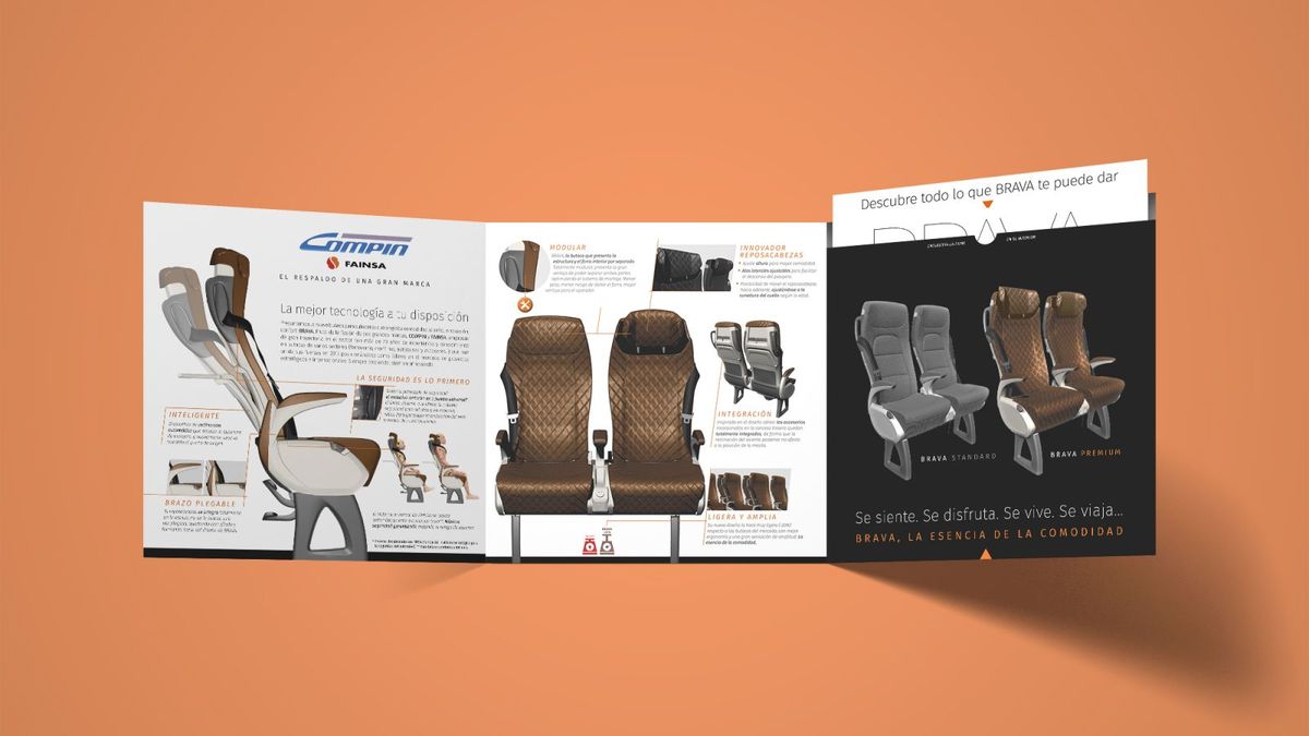 Grupo europeo líder en el acondicionamiento de interiores para vehículos de transporte público por carretera y ferroviario, interurbano y de largo recorrido. Diseño de tríptico con ficha insertada y textos para presentación de Silla Brava en dos idiomas, publicidad prensa  y postales de Navidad